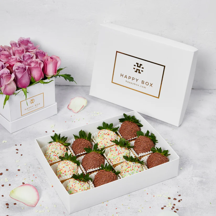 Swiss milk chocolate dipped strawberries with sprinkels in gift box.