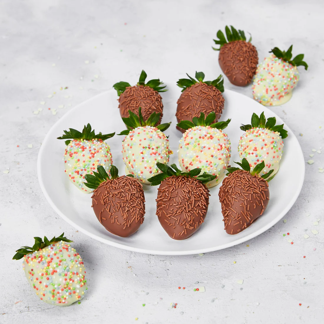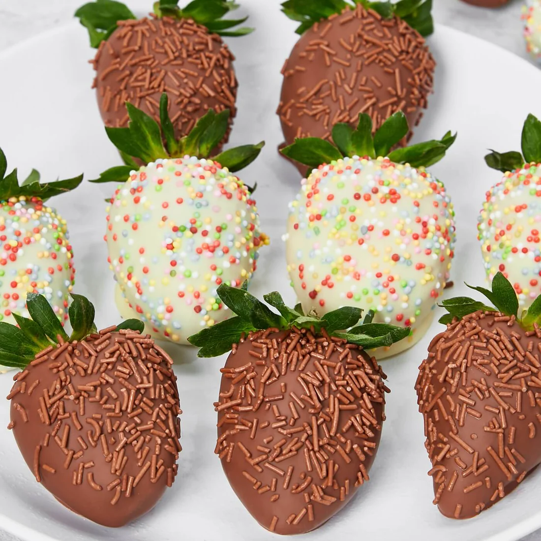 Blow out the candles… it’s time to celebrate a birthday! Our fresh, juicy berries are dipped in Swiss white and milk chocolate, decorated with rainbow and chocolate sprinkles to make someone’s special day exceptional!