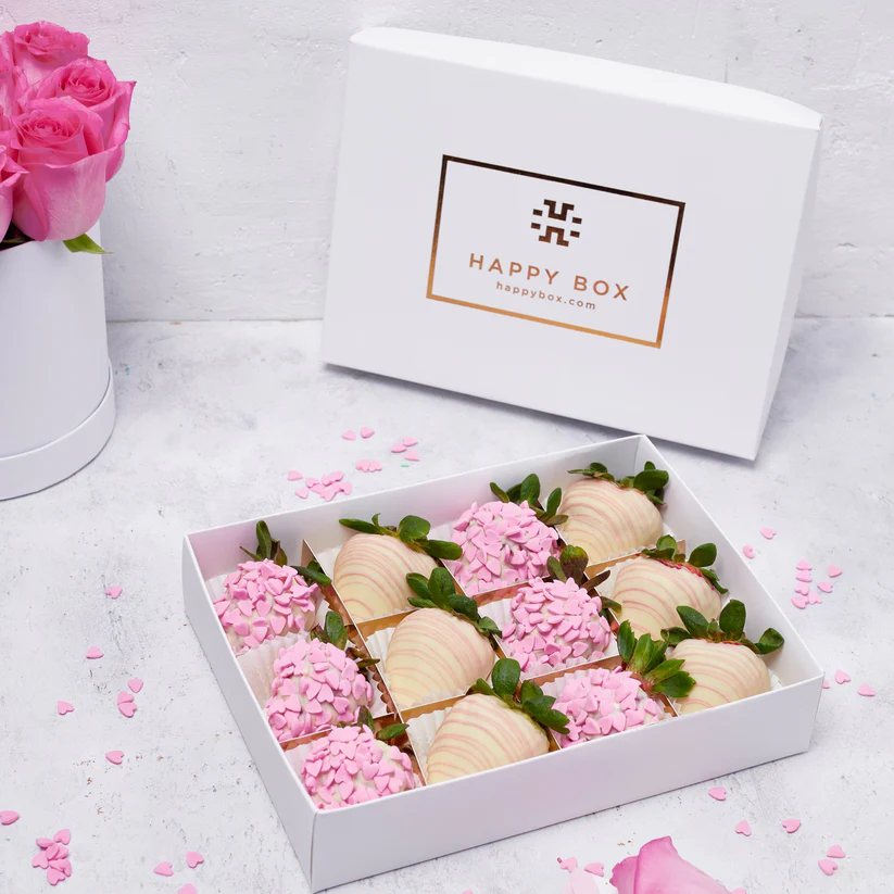 Swiss white chocolate dipped strawberries with sprinkles in a gift box.