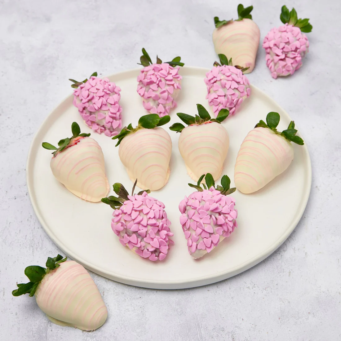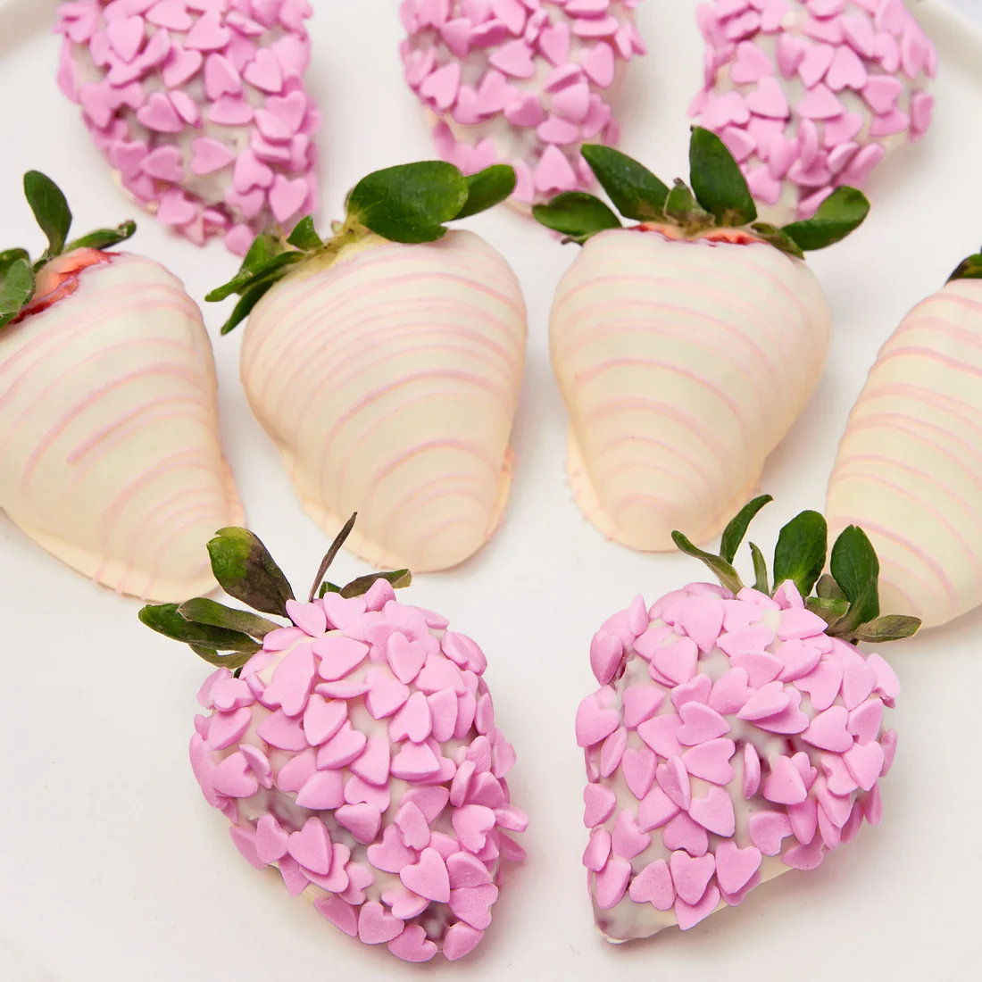 Love at first sight! These berries are decorated to impress! Plump fresh strawberries, dipped in our signature white belgian chocolate and decorated which candy hearts.