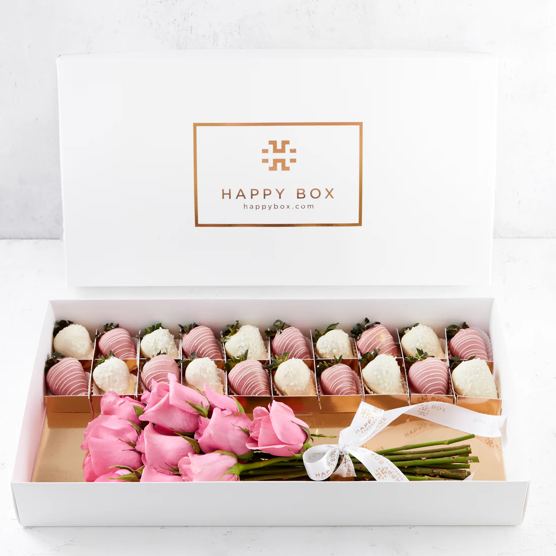 Discover passion and pleasure in one decadent place. This box holds a fresh bouquet of pink roses nestled among juicy strawberries dipped in rich white and pink strawberries.