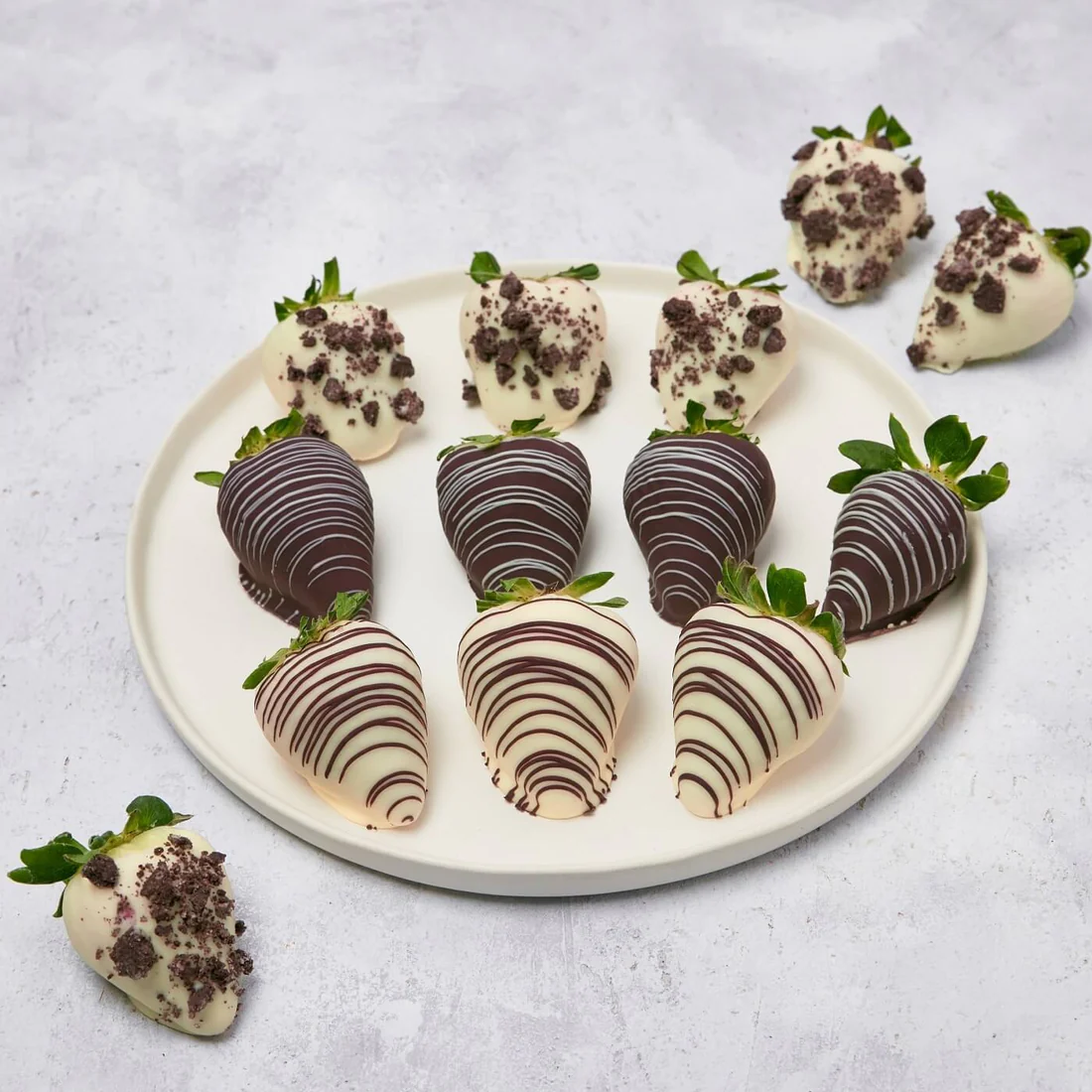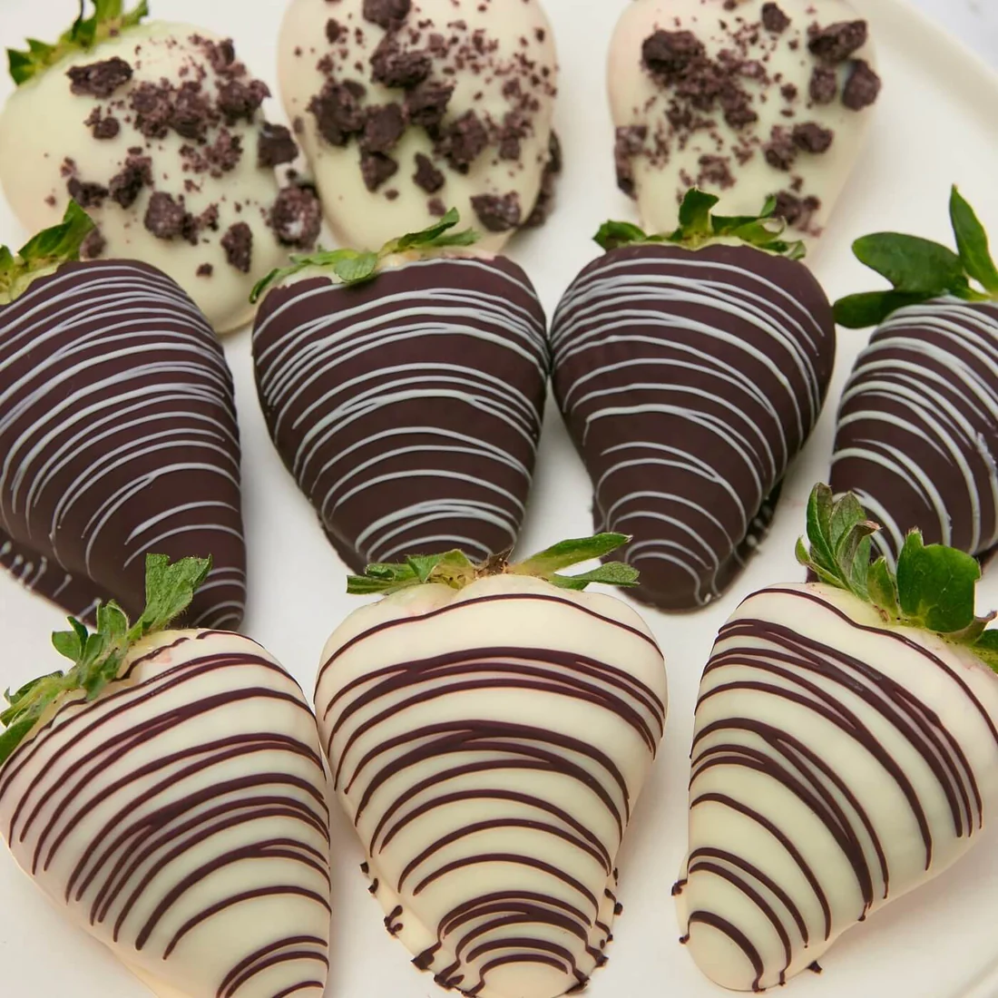 Oreo berries Chocolate dipped berries don’t get yummier than this. Fresh strawberries, hand-dipped in creamy milk and white chocolate, decorated with Oreo pieces. It’s a treat for the taste buds they won’t forget!