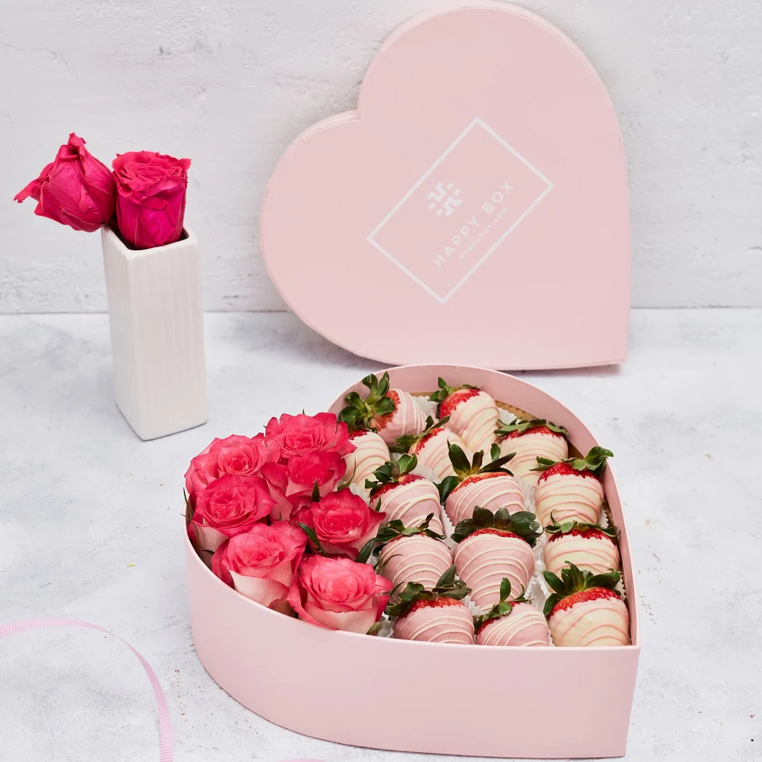 Heartshaped  Gift Box with Pink Roses and Srawberries Chocolate.